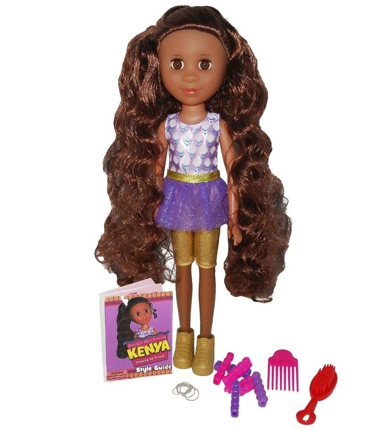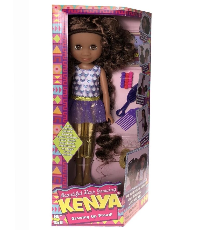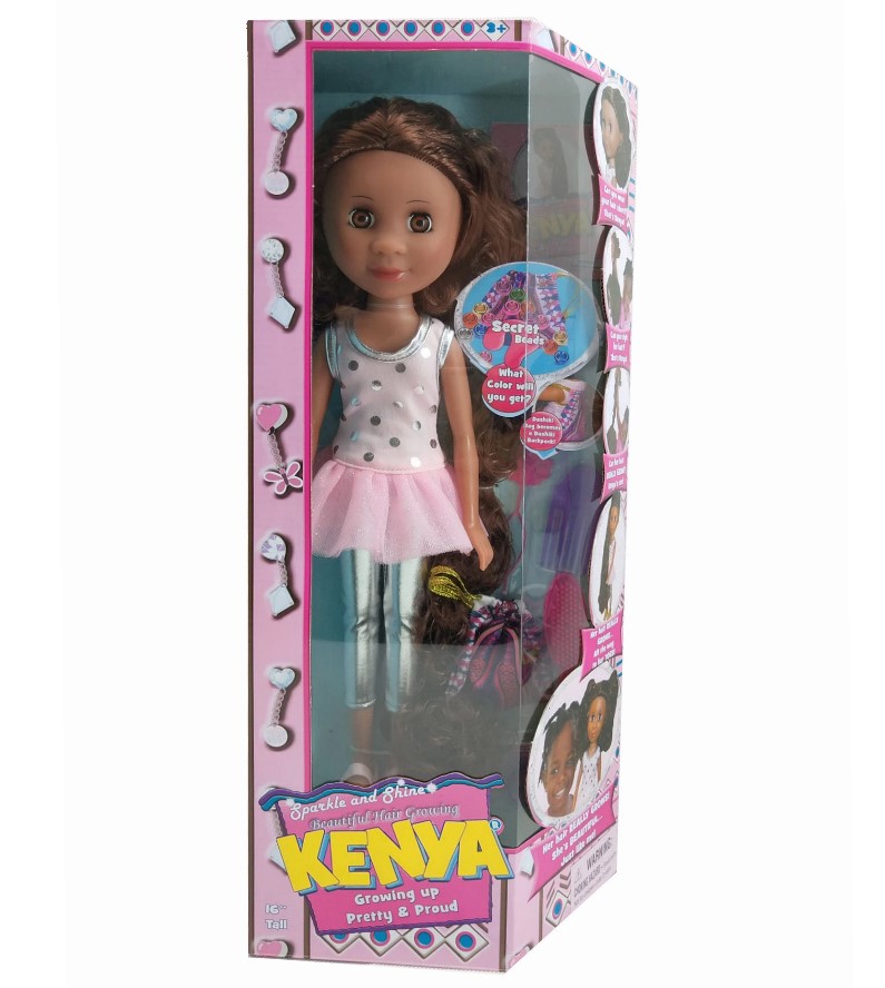 Hair Growing Kenya® is 16" tall and fully poseable. She comes dressed in a sparkly outfit with matching sneakers, a headband, and earrings. Her hair REALLY grows all the way to her toes!