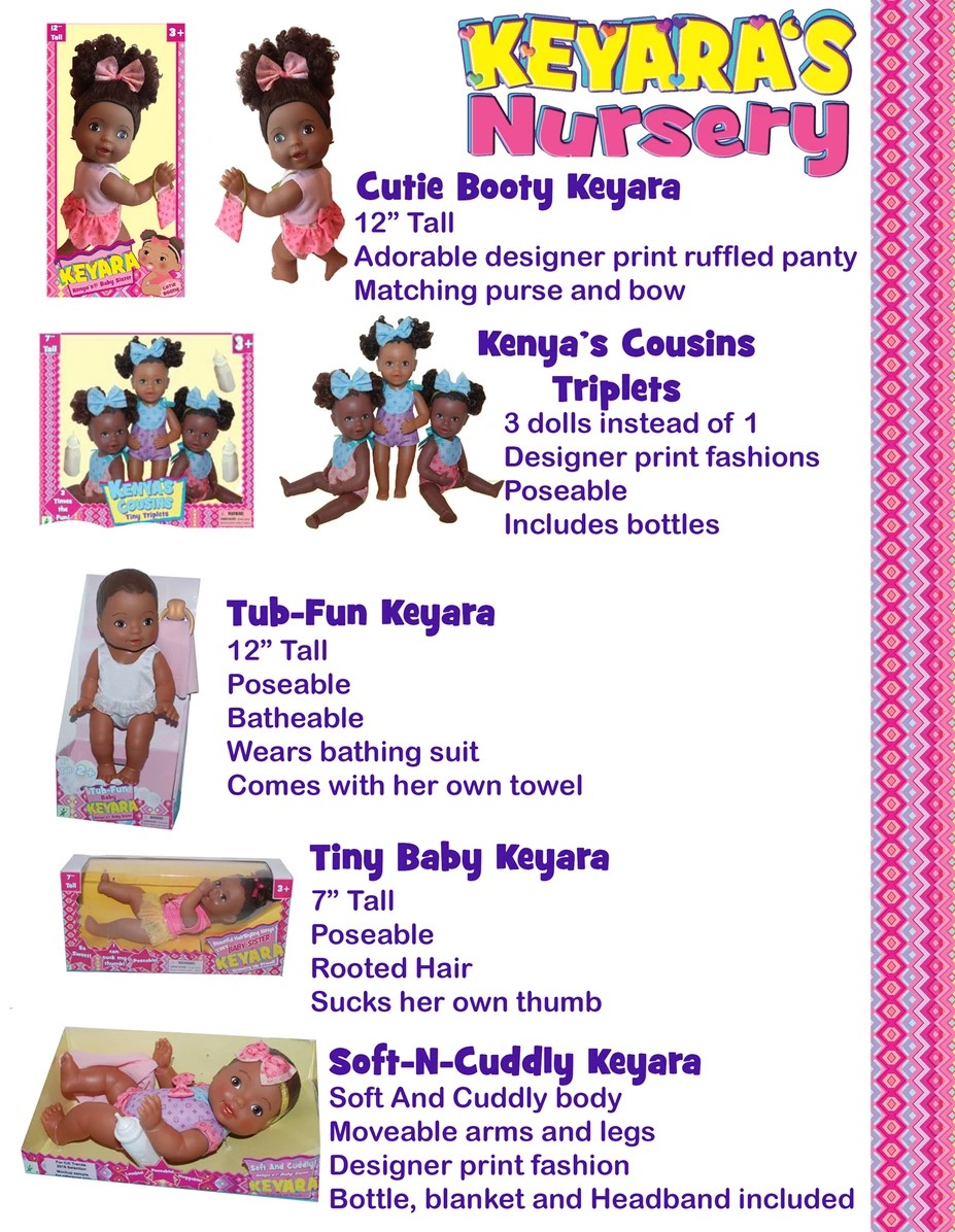 Keyara comes in three shades which represent the beautiful variety of African American skin tones. Join Kenya, her baby sister Keyara, cousins and her wonderful friends too! All representing the African American, Hispanic/Latino and Caucasian communities.
