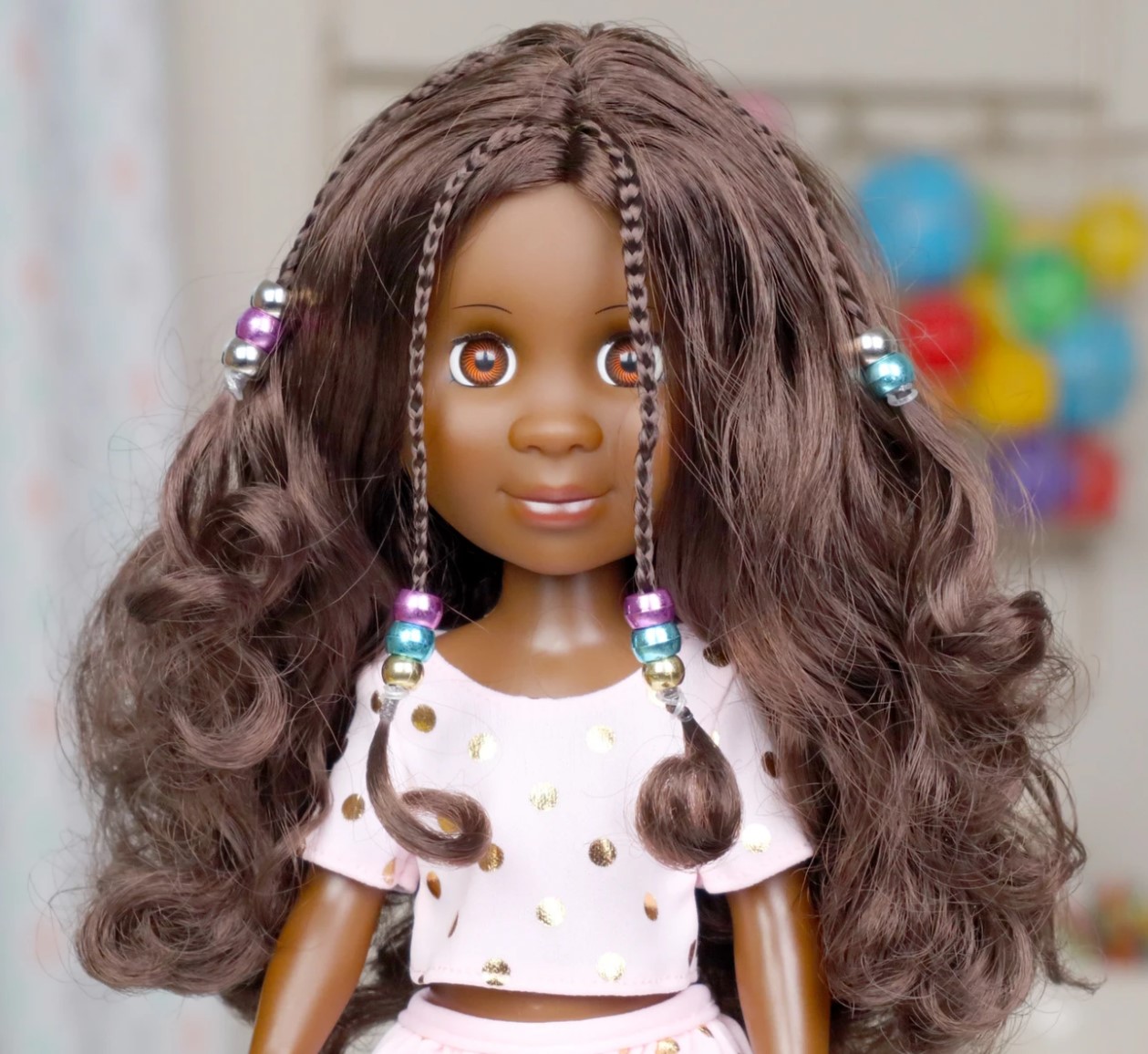 Now lets talk about HAIR! Kenya is all about beautiful styling hair! Kenya has realistic curly hair that goes straight when you add the magic lotion! You can even wash Kenya's hair! Braid it, bead it, style it! That's Kenya!